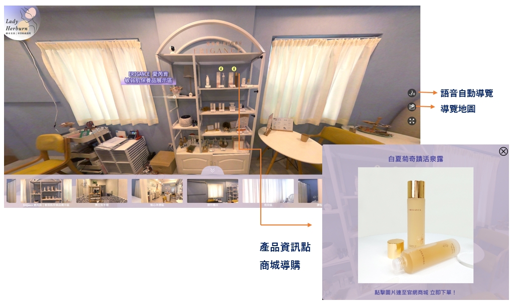 【商城導購】 360全景導覽也適用於產品陳列。透過商城導購功能,讓客戶直接在虛擬展館中購買產品,即時增加銷售轉換率,開創新的商機。